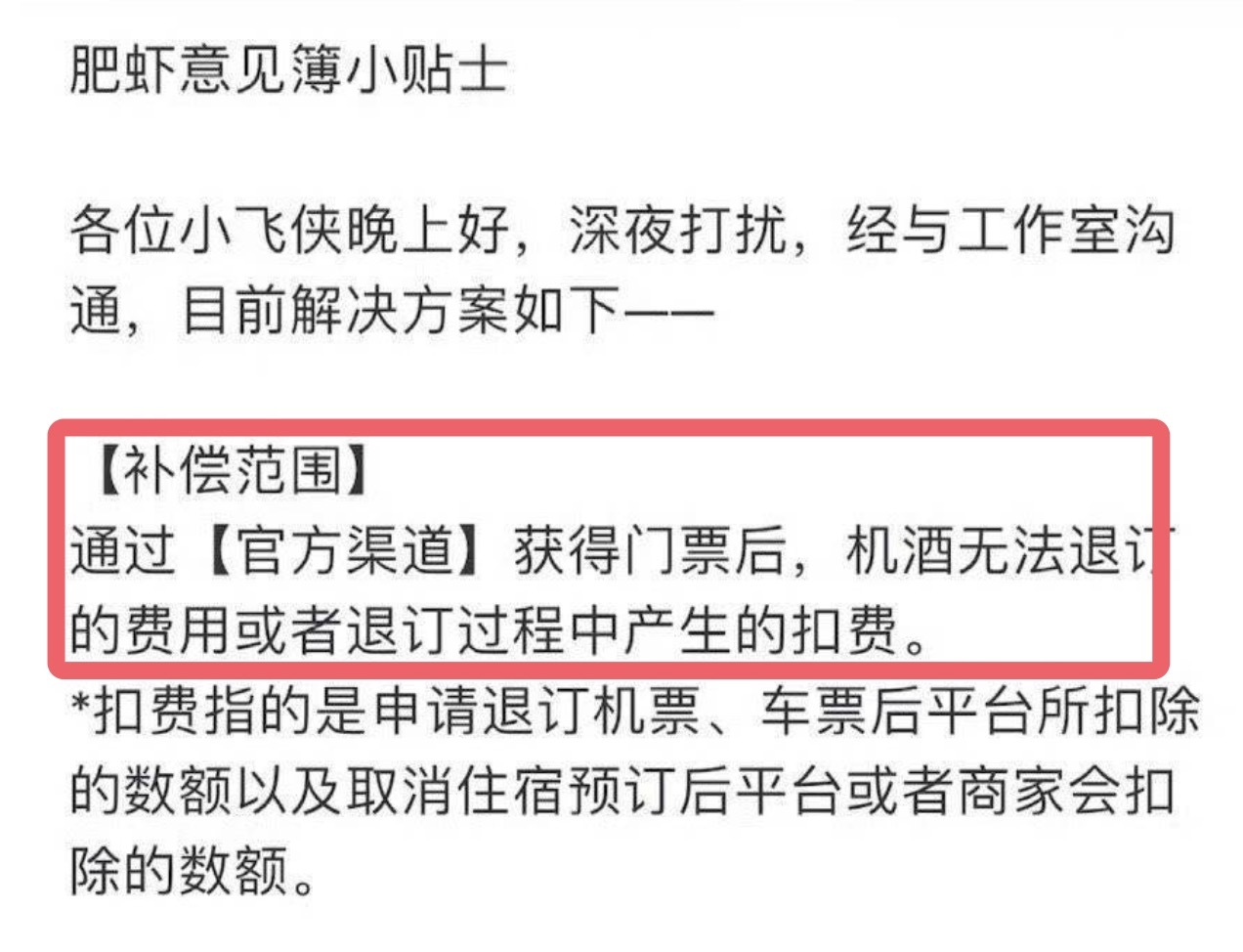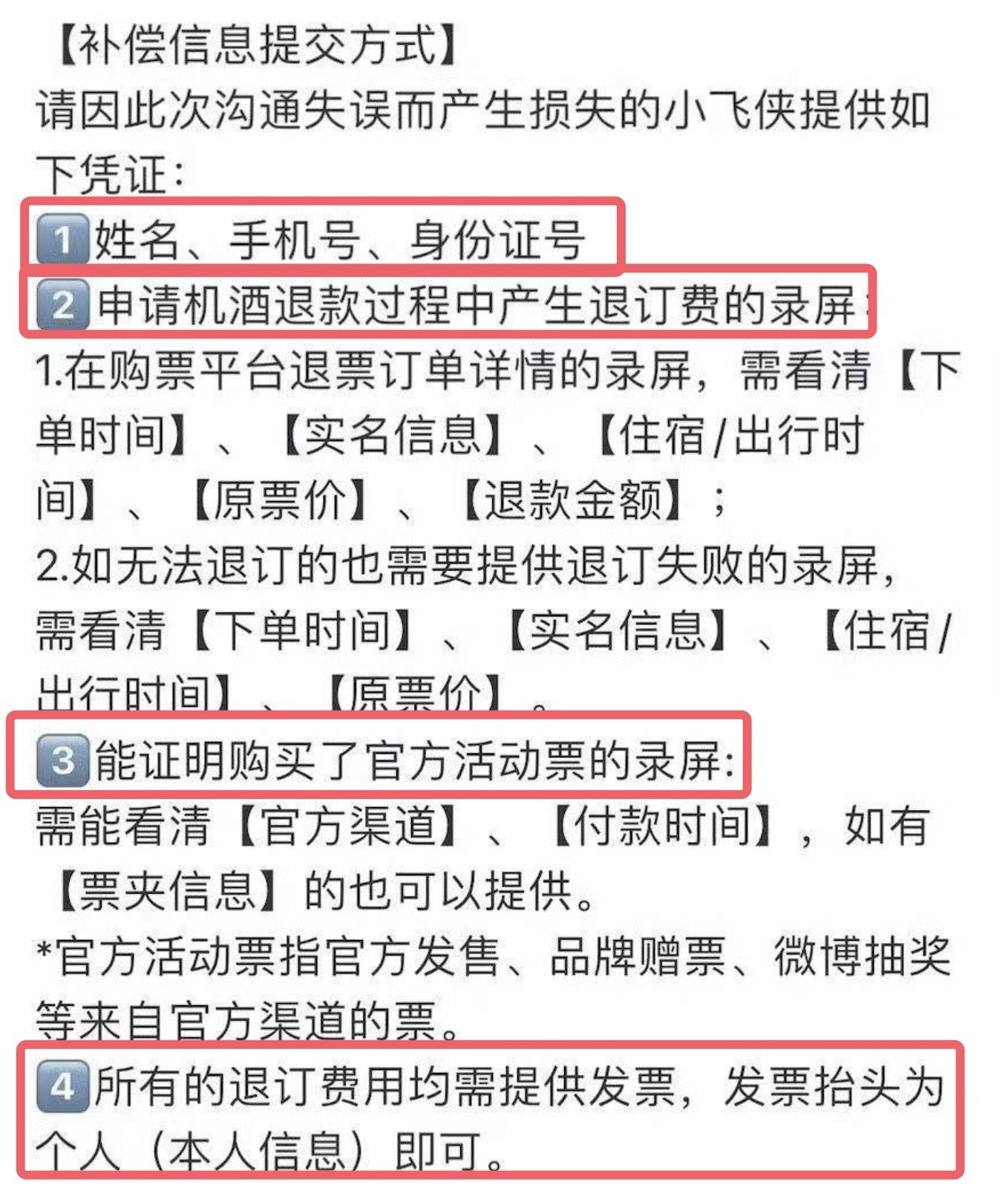 天然,肖战方并不是赔偿所有用度,像机票和住宿费等用度,只赔偿退票后,被扣除未退款的那部分用度。而赔偿的条款则需提供本东谈主的身份信息,以及退款流程中的录屏。至于门票则只退通过官方渠谈购买的门票,这也就意味着,那些通过黄牛党抢的高价票,是不在这些赔偿鸿沟之内的。