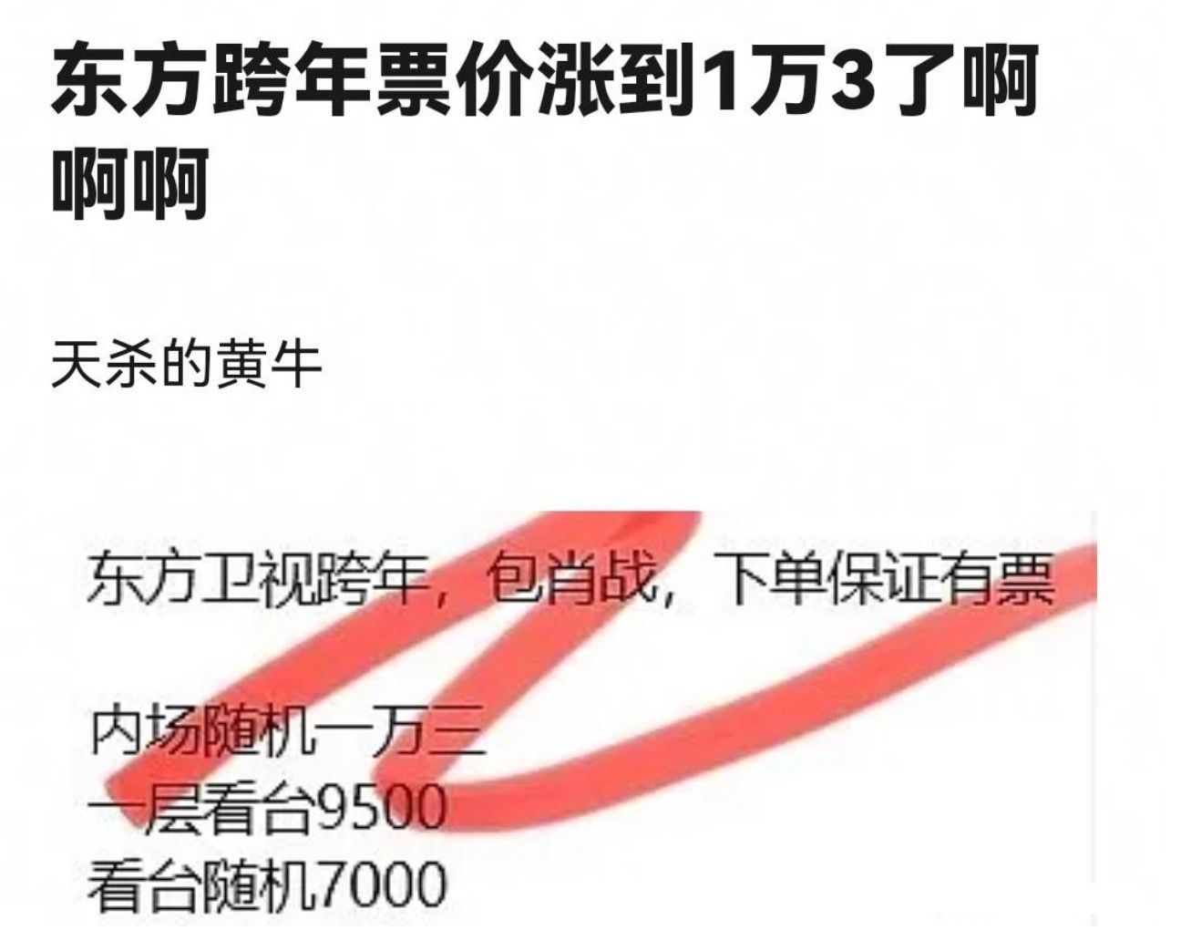而黄牛党在得知该音信后,更是平直叫停之前的晚会门票报价,原地加价。东方卫视的跨年演唱会门票亦然平直从千元飙升至1万三,固然价钱飙涨,关联词仍然一票难求。